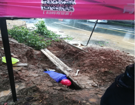 2020年10月15日星期四,15:05分,水电中心的柏杨顶着瓢泼的大雨,“深陷泥潭”中抢修破损主水管。虽然借来临时搭建的雨棚,也阻挡不了雨水的冲刷。由于主水管破损位置且附近有线路,开挖范围局限,导致开挖的坑口狭窄,维修难度大,加上恶劣的天气,原本用泵抽干的泥坑时不时地又渗出了不少水,阻碍了维修进度。柏杨不停地用盆往外舀水直至露出水管,找准破损位置,经过半个多小时的管件修复,终于恢复了正常供水。