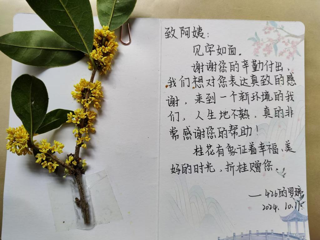 (本网讯邱晓娥报道)桂花,象征着收获与感恩。近日,在学生公寓光华社区,上演了温馨感人的一幕。426室2024级新生罗婷折桂赠阿姨,以表达对阿姨的感恩之情。