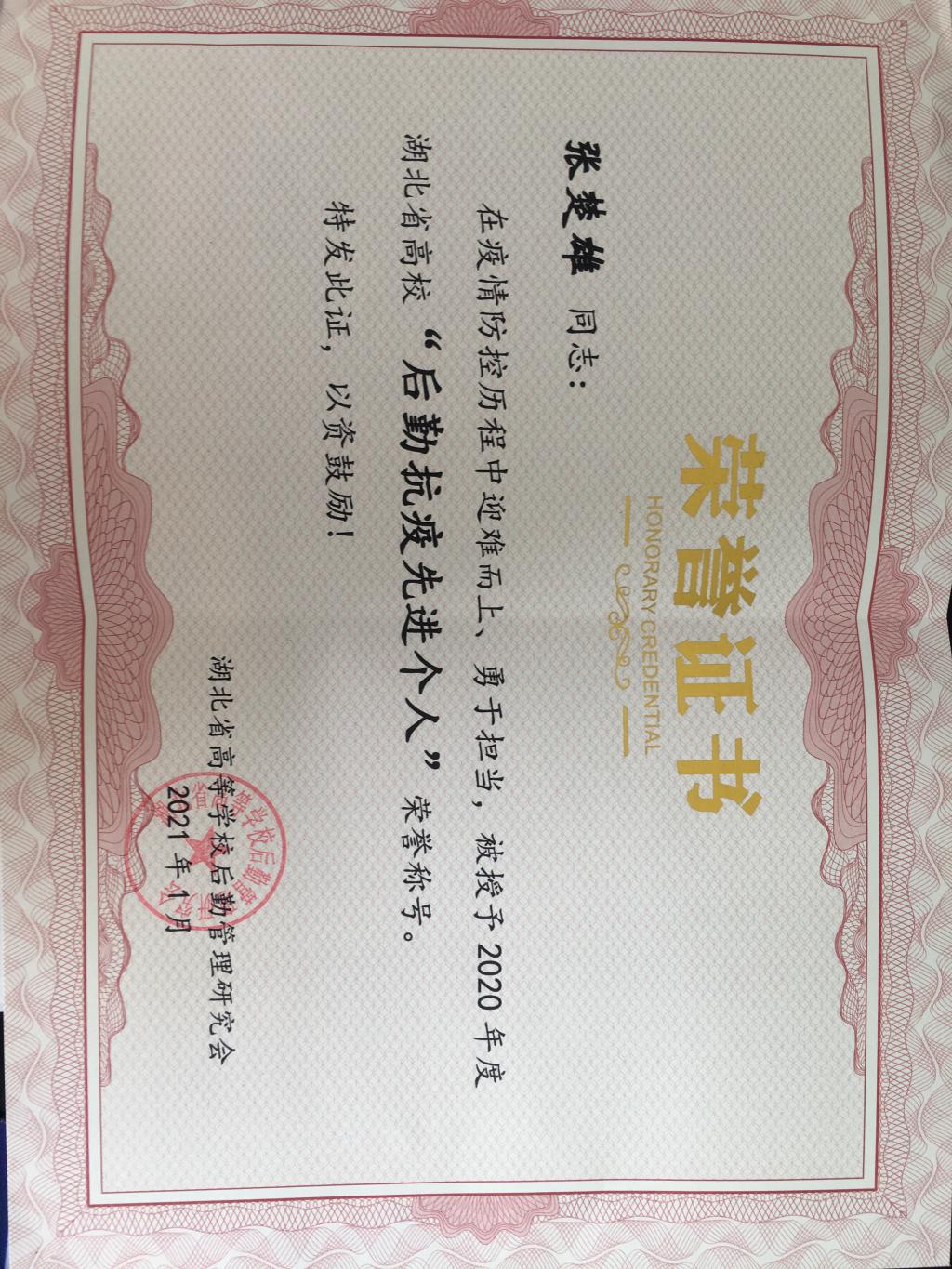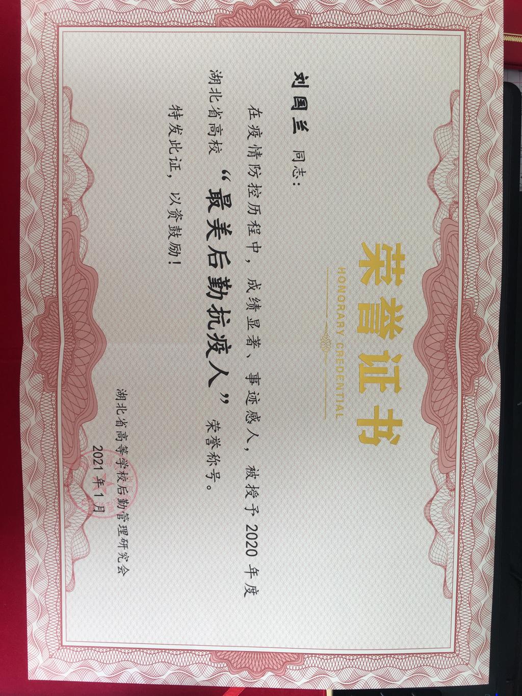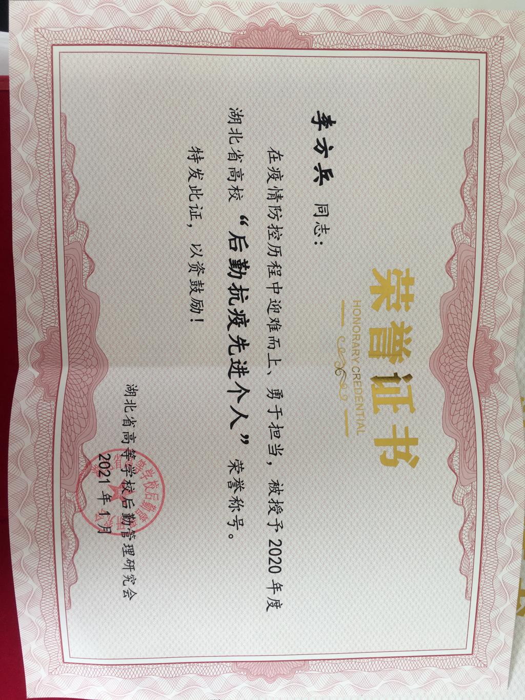 恭贺李方兵、张楚雄荣获由湖北省高校后勤管理研究会颁发的“后勤抗疫先进个人”的荣誉证书,刘国兰荣获由湖北省高校后勤管理研究会颁发的“最美后勤抗疫人”的荣誉证书。他们用实际行动践行了后勤人勇战抗疫第一线,不计报酬,不畏艰难,不计劳苦的高风亮节。