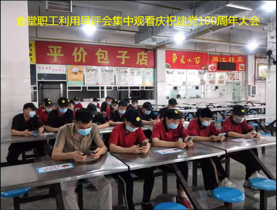 2021年7月1日,中国共产党建党100周年庆,后勤公司党支部组织饮食服务中心职工在西苑餐厅集中观看了习近平总书记在百年庆祝会上的重要讲话。